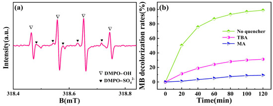 To further explore the role of ·OH and ·SO4−1 in the degradation of MB, radical trapping experiments were performed to track the contribution of ·OH and ·SO4−1 radicals during the electrocatalytic reaction. Methanol (MA) and Tertbutanol (TBA) were used as free radical scavengers. MA could capture both ·OH and ·SO4−1 radicals, while TBA was only adopted as the scavenger of ⋅OH radicals [38]. Figure 9b clearly indicates that ·OH played a primary role in MB degradation. From Figure 9b, it can be observed that the efficiency of MB degradation decreased significantly when MA and TBA were added to the wastewater containing MB. The high suppression ratios indicate that the indirect oxidation process is mainly responsible for the degradation of MB.