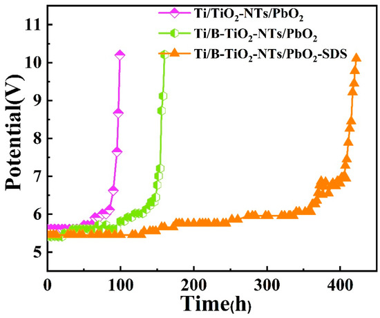 Therefore, the highest OEP would favor the Ti/B-TiO2-NTs/PbO2-SDS electrode and exhibit a stronger oxidation ability for the electrochemical oxidation of organics [21]. A higher OEP value means a substantial amount of ·OH could be generated and accelerate the electrochemical degradation of contaminants, leading to a stronger electrocatalytic ability with higher current efficiency.