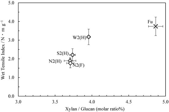 Figure 1 shows the relationship between the wet tensile index (in 44 mmol/L potassium hydroxide solution) [1] and glucuronoxylan content (the molar ratio of xylan to glucan) of the usu-mino-gami reported in the first paper. As can be seen, a higher wet tensile index correlated with a higher glucuronoxylan content. Consistent with this finding, the sample with the highest wet tensile index, Fu, also had the highest glucuronoxylan content, while the sample with the lowest wet tensile index, N2(F), had the lowest glucuronoxylan content. These results suggest that weaker cooking conditions are conducive to enhancing the wet tensile strength of usu-mino-gami and that glucuronoxylan content increases in the process.