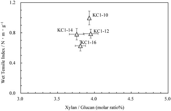 The relationship between xylan/glucan molar ratio and wet tensile index for kozo sheets.