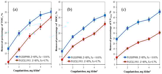 The effect of the type and dose of a coagulant on the efficiency of removing TOC (a), DOC (b) and UV254 (c).