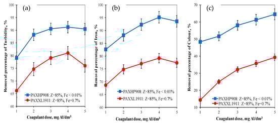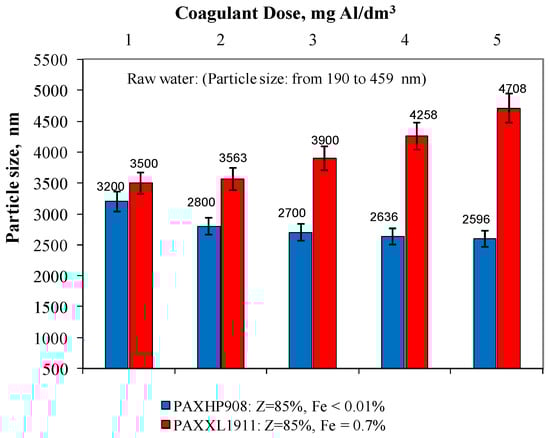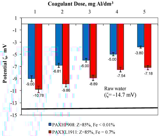 According to reports in the literature [25,26,27] with the increase in the absolute value of the potential ζ, the stability of colloids increases. The coagulation process is mainly based on double layer repulsive potential reduction by neutralisation of surface charge of pollutants, and zeta potential is the parameter that provides the information about the charge neutralisation status [28]. In the presented study, we have shown the results of the zeta potential measurement evaluation as a coagulation process control. The extent to which the colloids in the water being treated are destabilised makes a notable contribution to the efficiency of their removal by coagulation. As was expected, the extent of destabilisation increased with the increase in the coagulant dose (which varied from 1 to 5 mgAl/dm3). Analysis of the dependences presented in Figure 3 showed that the higher degree of destabilisation of the electro-kinetic potential, which varied between −9.00 mV and −3.80 ± 0.01 mV, was obtained in samples of water during coagulation with polyaluminium chloride PAXHP908 over the entire range of tested doses from 1 to 5 mg Al/dm3. The degree of destabilisation of the electro-kinetic potential value after coagulation with coagulant PAXXL1911, characterised by an alkalinity of 85% and containing iron compounds in its composition, ranged from −10.78 mV to −7.18 ± 0.01 mV. The zeta potential for post-coagulation water samples was lower than that found for raw water (−14.7 mV); however, no transition of this potential through the isoelectric point was detected. This may point to the possibility of increasing coagulation effectiveness by an increase in coagulant dosage, but this is not economically justifiable.