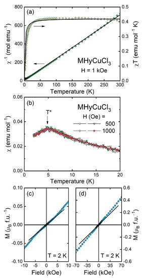 At low temperatures, MHyCuCl3 exhibited a broad anomaly in the temperature variation of the magnetic susceptibility with a maximum at T* = 4.8 K (Figure 5b), being very similar in shape to that found in its counterpart with Mn2+, yet much smaller [30]. In addition, here, χ(T) was independent of the magnetic field H (at least in low fields) and showed no difference between the curves taken in the ZFC and FC regimes, which suggests antiferromagnetic ordering. The antiferromagnetic-like character of the observed anomaly was confirmed by the linear field dependence of the magnetization (Figure 5c,d), exhibiting only a small change in its slope of about 3 kOe. In the highest field applied (70 kOe), magnetization M is far from any saturation and achieves a value corresponding to only 0.45 μB, which is much smaller than μord = 3 μB and 1 μB expected for full and spin-only magnetic moment of Cu2+, respectively.