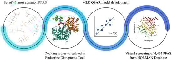 In the presented work we raised the important topic regarding the effects of the presence of PFAS in the environment and their impact on humans. We have applied an integrated computational approach, consisting of several steps allowing for virtual screening of PFAS in terms of their ability to bind to the NHRs. Firstly, using free-available software [41] we have calculated the binding scores of 43 PFAS to human nuclear hormone receptors (PPARα, PPARβ, PPARγ, TRα, and TRβ). Then using obtained values, we developed and validated five QSAR models in accordance with the standards and recommendations of the Organization for Economic Co-operation and Development (OECD) [46,47,48]. Finally, we have performed a virtual screening of the binding potential of 4464 PFAS from the NORMAN Database to NHRs. The stages of our work are shown in Figure 1.