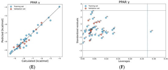In this work five models to predict PFAS binding probability to PPARα, PPARβ, PPARγ, TRα, and TRβ were developed. After collecting docking scores from the Endocrine Disruptome tool [41] the dataset was split into training (T) and validation (V) sets by following the “1:Z” algorithm [76]. In this case, every Zth compound in a group of chemicals, sorted by calculated values of docking score in ascending order, was assigned to the validation set, and the remaining compounds created the training set. Here, for PPARα, PPARβ, and TRβ, Z = 3, while for TRα and PPARγ Z = 4, which means 14 and 10 compounds were assigned to the validation set, respectively. The training set is used to build the model and the validation set is necessary to assess the predictability of the QSAR model [77]. Before training the models for estimating binding energy to NHRs, the independent variables (descriptors) and dependent variables (docking scores) were preprocessed by standard scaling [78]. For scientific validity of the QSAR models [49] all of them were developed in accordance with the standards and recommendations of the Organization for Economic Co-operation and Development (OECD) [46,47,48]. The analyses were carried out using packages available in Python 3.8.8 [79]. For defining the relationship between the structure of PFAS and binding probability (endpoint) to NHRs the multiple linear regression (MLR) method [80,81] was applied. Structural descriptors, which have an influence on the probability of binding to the receptor, and which were readily interpretable, were selected. Only a combination of molecular descriptors, which correlation does not exceed 0.6, were considered. One of the most important stages in the calibration of the QSAR model is to verify the goodness-of-fit by calculating the appropriate parameters. In this work, the squared regression coefficient (R2), which measures the variation of observed data with the fitted one (preferably if R2 is equal to 1) and the root mean square error of calibration (RMSEC), based on the prediction for the training set, were estimated. To demonstrate the robustness and predictive ability the validation of obtained models was divided into two main steps: (i) internal validation (by using the training set) and (ii) external validation (by using the validation set). In the case of internal validation, the leave-one-out cross-validation method was used. This involves modifying the original training set of n compounds by removing one compound and predicting its activity using the model developed with n-1 compounds. Several parameters were estimated for verifying the robustness of the developed models: cross-validation coefficient (Q2LOO), the root mean square error of cross-validation (RMSECV), mean absolute error (MAECV), concordance correlation coefficient (CCCCV) [42]. The external validation of the developed models was performed using the validation set defined in the first step of the modeling procedure. To indicate if the developed models predict correctly, the external coefficients Q2 (F1, F2, and F3), the root mean square error (RMSEEXT), and the mean absolute error (MAEEXT) were calculated. In addition, a parameter CCCEXT (concordance correlation coefficient), which measures precision and accuracy, detecting the distance of the observations from the fitting line was obtained [82]. All calculated parameters can be found in Supplementary Materials S1. A detailed description of the applied metrics can be found in the literature [83]. To ensure that developed models are not correlated by chance, the Y-randomization has been performed and the R2YSCR was evaluated. The applicability domain (AD), defined as the scope and limitations of a model, was verified using the Williams plot [48,81] and Insubria graph [55] (according to h*). Williams plot is a graphical representation of standardized residuals (y-axis) versus leverages (hat values; x-axis) for each compound of the dataset [84]. The QMRF documents for all five developed models are implemented in Supplementary Materials S2.