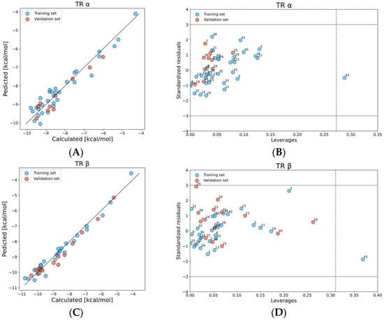 Plot of calculated versus predicted values of binding scores TRα, and β (A,C). Williams plot: dash line indicates the critical leverage value, solid lines represent ±3 standard deviation units (B,D).