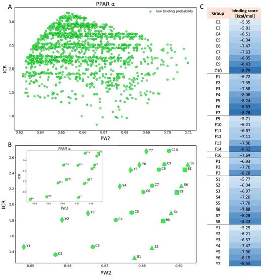(A) Scatter plot of binding scores obtained for PPARα in PW2 and ICR space; (B) scatter plot for PPARα showing the division of PFAS into five different structural groups in space of PW2 and ICR. C-carboxylic acids (COOH-(CF2)n-CF3), S-sulfonic acids (SO3H-(CF2)n-CF3), P-phosphonic acids (PO3H2-(CF2)n-CF3, F-Fluorotelomer alcohol (F1-F7(OH-(CH2)-(CF2)n-CF3), F8-F14 (OH-(CH2)2-(CF2)n-CF3), F16 (OH-(CH2)3-(CF2)n-CF3), F17 (OH-(CH2)4-(CF2)n-CF3)), Y-dicarboxylic acids (COOH-(CF2)n-COOH). Colors: green-low binding probability; (C) Table showing binding score values for each compound shown in chart B.