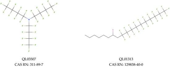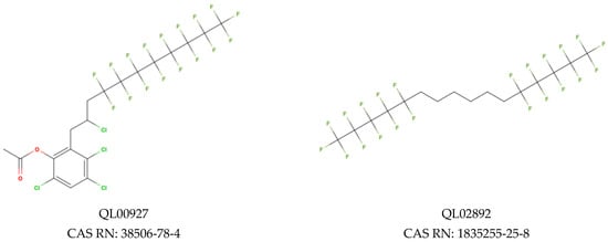 Regarding the screening for PPARβ, we have classified the predictions into two groups: low binding probability (green-2108 PFAS) and moderate binding probability (yellow-122 PFAS). In Figure 5A we have presented the correlation between ICR (corresponds to a number of branching), X% (percentage of halogen atoms), and PFAS binding potency to PPARβ. The docking scores estimated for this endpoint range from −9.88 to −9.60 for the moderate binding probability class (yellow) and from −9.59 to −4.67 for the low binding probability class (green). An analysis of the descriptor values shows that compounds with more halogen atoms (high X% value), and more branches in the main chain have lower binding scores (they bind more strongly to the receptor) [58]. Worth considering is that QL01313 (Figure 6), despite the relatively low content of halogen atoms (X% = 40%), was in the group of compounds with a moderate probability of binding due to the high value of branching (ICR = 3.24). However, in the same group, there is also less branched compound (ICR = 2.35): QL03507 (Figure 6), which consists of 12 atoms of carbon and contains a lot of fluorine atoms in its structure (X% = 67.5%). Both mentioned PFAS were classified into a group with a moderate probability of binding (Figure 5A).