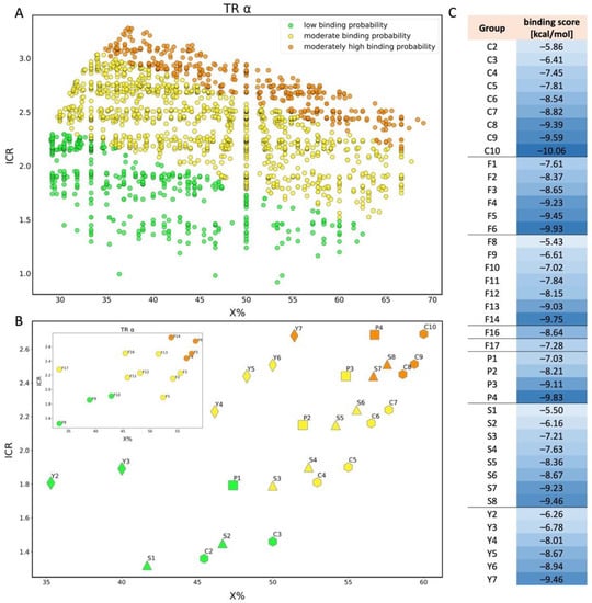 Scatter plot of binding scores obtained for TRα in X% and ICR space (A); scatter plot for TRα showing the division of PFAS into 5 different structural groups in space of ICR and X%. C-carboxylic acids (COOH-(CF2)n-CF3), S-sulfonic acids (SO3H-(CF2)n-CF3), P-phosphonic acids (PO3H2-(CF2)n-CF3, F-Fluorotelomer alcohol (F1-F7(OH-(CH2)-(CF2)n-CF3), F8-F14 (OH-(CH2)2-(CF2)n-CF3), F16 (OH-(CH2)3-(CF2)n-CF3), F17 (OH-(CH2)4-(CF2)n-CF3)), Y-dicarboxylic acids (COOH-(CF2)n-COOH). Colors: green-low binding probability, yellow-moderate binding probability, orange-moderately high binding probability (B); table showing binding score values for each compound shown in chart B (C).