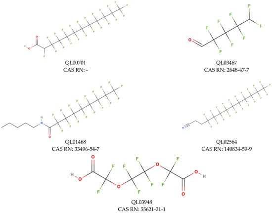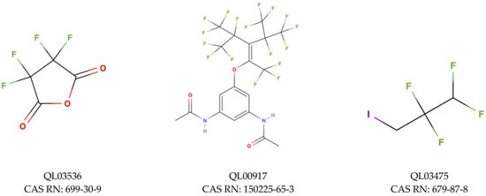 For TRα, the minimum and maximum values of the estimated endpoint were −10.06 and −4.36 kcal/mol respectively, and the hat value obtained was h* = 0.273. Compounds that were found between the minimum and maximum value of predicted binding energy for the training set and do not exceed the value of h* are classified as a compound in the structural space of the model. We have classified 2104 compounds as outliers (52.9% coverage). Information about all compounds outside the structural AD is attached in Supplementary Materials S1. Compounds falling into the applicability domain of the TRα model (Figure 8A) represent three classes of binding: low binding probability (504 chemicals), moderate binding probability (1400 chemicals), and moderately high binding probability (456 chemicals). Based on standardized coefficients used in the QSAR model we can indicate that ICR is a descriptor that has a greater influence on the outcome of the estimated value of binding probability to the receptor than X%. In the first class (green–low binding probability) the range of values for the X% is from 29.03 to 62.5, and for the ICR it is from 0.92 to 2.29. Compound QL03536 (Figure 9), with the highest value of energy (−4.36 kcal/mol), has a low value of ICR (0.99) and X% value that equals 36.36, and is a cyclic structure with four halogen atoms in the structure. On the other hand, the lowest value of energy (−7.19 kcal/mol) has a molecule QL00917 (Figure 9) with a high ICR value (2.27) resulting from a large number of branching, and the X% equals only 32.69. In the second class (yellow–moderate binding probability) the range of X% values are from 29.73 to 67.74, and of ICR is from 1.52 to 3.04. Compound QL03467 (Figure 9) is the carboxylic acid with almost all carbon atoms fully substituted by fluorine, and it has the highest value of energy (−7.20 kcal/mol), one of the lowest values of ICR (1.79), and X% equals 50.00. The lowest value of energy (−9.19 kcal/mol) has molecule QL01468, with a high value of ICR due to the main chain of 15 atoms and X% equals 37.78. In the class with moderately high binding probability, the compound with the lowest energy value (−10.06 kcal/mol) is QL00701 (Figure 9). It has a relatively high value of X% (57.89) because almost all atoms are completely substituted with fluorine and the value of ICR is equal to 2.75 which is close to the mean value of this descriptor in the group.
