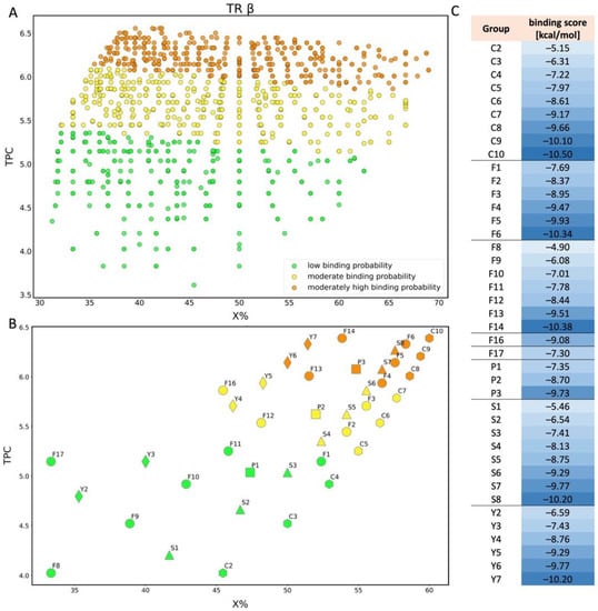 Scatter plot of binding scores obtained for TRβ in X% and TPC space (A); scatter plot for TRβ showing the division of PFAS into 5 different structural groups in space of TPC and X%. C-carboxylic acids (COOH-(CF2)n-CF3), S-sulfonic acids (SO3H-(CF2)n-CF3), P-phosphonic acids (PO3H2-(CF2)n-CF3, F–Fluorotelomer alcohol (F1–F7 (OH-(CH2)-(CF2)n-CF3), F8-F14 (OH-(CH2)2-(CF2)n-CF3), F16 (OH-(CH2)3-(CF2)n-CF3), F17 (OH-(CH2)4-(CF2)n-CF3)), Y-dicarboxylic acids (COOH-(CF2)n-COOH). Colors: green-low binding probability, yellow-moderate binding probability, orange-moderately high binding probability (B); table showing binding score values for each compound shown in chart B (C).