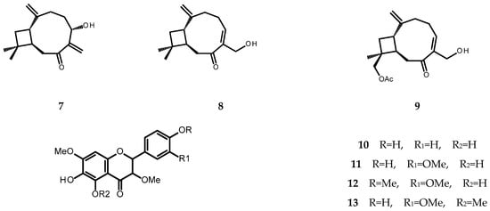 Chemical structures of terpenoid compounds isolated from the chloroform extract of Pulicaria inuloides: 1—8,9-epoxy-10-isobutyryloxythymyl isobutyrate; 2—(1S,9R)-5α-acetoxycaryophylla-2(15),6(14)-dien-7-one; 3—(1S,9R)-14-acetoxycaryophyll-5(6)-en-7-one; 4—8-hydroxy-9,10-diisobutyryloxythymol; 5—8-hydroxy-9-isobutyryloxy-10-(2-methylbutyryloxy)thymol; 6—stigmasterol; 7—(1S,9R)-5α-hydroxycaryophylla-2(15),6(14)-dien-7-one; 8—(1S,9R)-14-hydroxycaryophyll-5(6)-en-7-one; 9—(1S,9R)-12β-acetoxy-14-hydroxycaryophyll-5(6)-en-7-one; 10—6-hydroxykaempferol 3,7-dimethyl ether; 11—quercetagetin-3,7,3′-trimethyl ether (chrysosplenol C); 12—quercetagetin-3,7,3′,4′-tetramethyl ether; 13—quercetagetin-3,5,7,3′-tetramethyl ether.