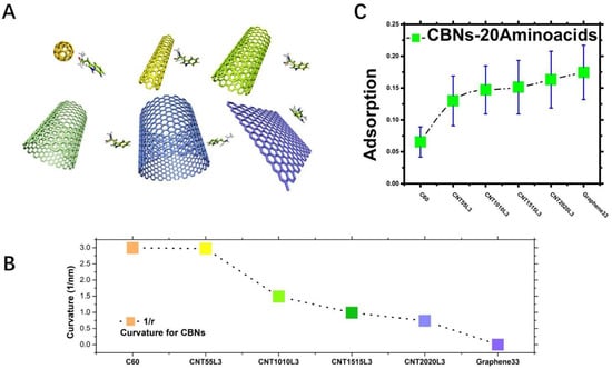 Our study found an interesting trend: that is, the smaller the curvature of the carbon-based nanoparticles, the better the adsorption of the amino acids. Figure 1A shows the six representative carbon-based nanoparticles. The curvatures of the CBNs we studied were different, as shown in Figure 1B. Their curvatures decreased continuously, from a curvature of C60 at 2.99401 to a curvature that approached zero for graphene. As shown in Figure S1D, the curvature span of our chosen carbon nanotubes was just between C60 and graphene.