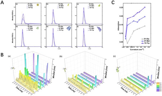 As shown in Figure 2C, the purple line is the short-chain amino acid 01-Gly, the yellow line is the hydrophobic amino acid 07-Met with the longest side chain, and the green line is the aromatic amino acid 15-Trp with the longest side chain: (1) non-polar hydrophobic short-chain amino acid 01-Gly. The contact between Gly and various CBNs is extremely unstable, as shown in Figure 2B(a). This unstable adsorption is also reflected in Mindist-PDF, and their first-peak values are all less than 0.15, as shown in Figure 2A: (2) non-polar hydrophobic long-chain amino acids 07-Met. The adsorption effect of 07-Met is moderate, as shown in Figure 2B(b). The adsorption effect between 07-Met and CBNs increases as the curvature decreases, as shown in Figure 2C: (3) aromatic amino acid 15-Trp. 15-Trp is an amino acid with the best adsorption effect on CBNs among aromatics, and it has a “bicyclic” side chain structure. The adsorption effect between 15-Trp and CBNs is relatively good.