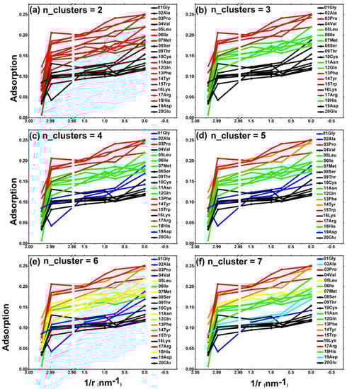 Our research separately counted the situation when n_cluster = 2,3,4,5,6,7. For example, during the process of changing from red to black in Figure 3a, the clustering value decreased successively. When n_cluster = 2, the amino acids in the upper region included the following: special hydrophobic amino acid 03-Pro; long-chain hydrophobic amino acid 05-Leu; 06-Ile, 07-Met; long-chain uncharged amino acid 11-Asn; 12-Glu; an all-aromatic group of amino acids 13-Phe, 14-Tyr, and 15-Trp; and partially positively charged amino acids 17-Arg and 18-His. When n_cluster = 3, as shown in Figure 3b, long-chain hydrophobic amino acids (05-Leu, 06-Ile, 07-Met) and long-chain uncharged amino acids (11-Asn, 12-Glu) fell out of the first echelon. When n_cluster = 4, the first echelon remained unchanged, and the lower zone began to split. When n_cluster = 4, as shown in Figure 3c, the median region began to change. The first echelon of the upper region was the red special hydrophobic amino acid 03-Pro, the long-chain aromatic amino acid 15-Trp, and the positively charged amino acid 17-Arg. The second echelon of the upper region was the orange aromatic amino acid 13-Phe and 14-Tyr. Next, when n_cluster = 5, 6, 7, as shown in Figure 3d–f, and regardless of which region, the amino acid arrangement changed and the first and second echelon of the upper region remained unchanged. The first echelon of the upper region was the red special hydrophobic amino acid 03-Pro, the long-chain aromatic amino acid 15-Trp, the positively charged amino acid 17-Arg, and the second echelon of the upper region is the orange aromatic amino acid 13-Phe and 14-Tyr.