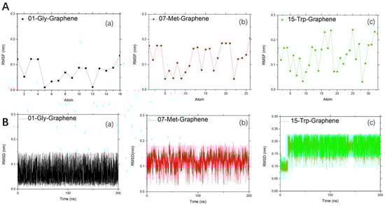 Study on the stability between representative amino acids and graphene: (A). Research on RMSF: (a) black dotted line for 01-Gly-Graphene; (b) red dotted line for 07-Met-Graphene; and (c) green dotted line for 15-Trp-Graphene; (B). Research on RMSD change within time: (a) black line for 01-Gly-Graphene; (b) red line for 07-Met-Graphene; and (c) green line for 15-Trp-Graphene.