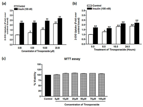 Dose- and time-dependent effect of tinosporaside on glucose uptake. (a) L6 myotubes were treated with different concentrations of tinosporaside for 16 h. After incubation, a subset of cells were stimulated with 100 nM of insulin for 20 min, which was followed by the determination of 2-DG uptake. (b) L6 myotubes were treated at 10 µM concentration of tinosporaside for a different time period and 2-DG uptake was determined in absence (white bars) or presence of 100 nM insulin (black bars). (c) L6 cells were treated with tinosporaside for 24 h at different concentrations, from 5 µM to 100 µM, and cytotoxicity was measured using the MTT assay. Results are expressed as fold stimulation over control basal. Results shown are mean ± SE of three independent experiments. * p < 0.05, ** p < 0.01, relative to control basal.
