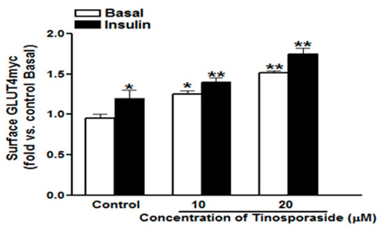 Dose-dependent effect of tinosporaside on GLUT4myc translocation in L6-GLUT4myc myotubes. Cells were incubated with 10 μM and 20 μM concentrations of tinosporaside for 16 h, with the final three hours in a serum-deprived medium. After incubation, myotubes were left untreated (white bars) or stimulated with 100 nM insulin (black bars) for 20 min, which was followed by the determination of the proportion of GLUT4myc at the cell surface. Results are expressed as fold stimulation over control basal. Results shown are mean ± SE of three independent experiments, each performed in triplicate. * p < 0.05, ** p < 0.01, relative to respective control condition.