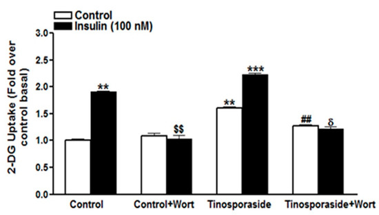 Effect of wortmannin on tinosporaside-induced glucose uptake in L6 myotubes: Cells were incubated in the absence (Control) or the presence of tinosporaside (10 μM) for 16 h without or with wortmannin (100 nM). After incubation, myotubes were left untreated (white bars) or stimulated with 100 nM insulin (black bars) for 20 min, which was followed by the determination of the glucose uptake. Results are expressed as fold stimulation over control basal and performed in triplicate. Results shown are mean ± SE of three independent experiments. ** p < 0.01, *** p < 0.001, relative to control basal; $$ p < 0.01, relative to control insulin-treated group; ## p < 0.01, relative to basal tinosporaside-treated group; δ p < 0.05 relative to tinosporaside insulin-treated group.