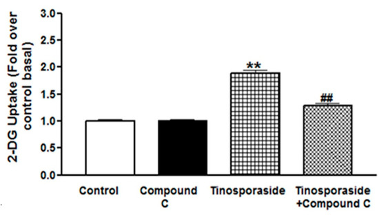 Effect of Compound C on tinosporaside-induced glucose uptake in L6 myotubes. L6 myotubes were treated with tinosporaside in the absence or presence of compound C for 30 min, which was followed by the determination of 2-DG uptake. Results shown are mean ± SE of three independent experiments. ** p < 0.01, relative to control; ## p < 0.01, relative to the tinosporaside treated group.