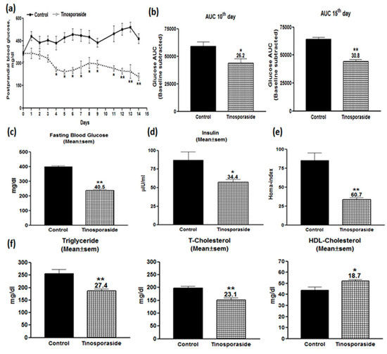 Given the in vitro effect of tinosporaside to stimulate glucose utilization in skeletal muscle cells, we further investigated it for in vivo antidiabetic activities in a genetically diabetic db/db mice model system. Tinosporaside was administered through oral gavages for 15 consecutive days at a 30 mg/kg dose. Figure 6a showed the effect of tinosporaside on postprandial blood glucose profile of db/db mice during the 15 days of uninterrupted dosing. It was found that tinosporaside treatment decreased the blood glucose level in a temporal manner; a significant decrease in blood glucose level was evident from day 4, and the effect persisted until the end of the experiment. To investigate the effect of tinosporaside on improvements in glucose tolerance, the oral glucose tolerance test (OGTT) was carried out on days 10 and 15 of the experiment. Figure 6b shows that, on day 10, tinosporaside effectively repelled the rise in postprandial hyperglycemia post-glucose challenge; an overall improvement in the glucose levels’ AUC from 0 to 120 min was calculated to be around 26.2% (p < 0.05). Meanwhile, on day 15, it was found that tinosporaside effectively inhibited the rise in postprandial hyperglycemia, post-glucose challenge (Figure 6b). The improvement in glucose AUC from 0 to 120 min from tinosporaside was calculated to be around 30.8% (p < 0.01), as compared with the vehicle-treated control group.