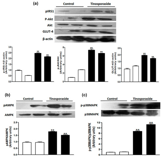We further validated the activation of the PI3K and AMPK signaling pathways underlying the anti-hyperglycemic and anti-dyslipidemic effects of tinosporaside at the protein level using western blot analysis of skeletal muscle tissues from db/db mice. It was found that tinosporaside significantly stimulated the phosphorylation of IRS-1 and AKT2, which are a critical node of insulin signaling (Figure 8) in skeletal muscle. The phosphorylation of AMPK and its downstream target p-38 MAPK at key activation sites was also increased in the muscle tissue of the tinosporaside-treated group, relative to control mice (Figure 8). Furthermore, tinosporaside increased the expression of GLUT4 protein in skeletal muscle of db/db mice These in vivo results are in accordance with the in vitro data, suggesting that tinosporaside treatment improved the glucose utilization in skeletal muscle via the activation of PI3K- and AMPK-dependent signaling pathways, leading to improved glucose homeostasis in db/db mice.