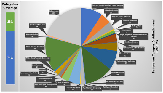 Lp YW11 genome consists of 3,181,760 base pairs, with 44.7% GC content, 231 subsystems, and 3065 genes. The genes present in the genome of Lp YW11 further comprised 26% sub-system and 74% non-subsystem coverage genes. The subsystem coverage contained 786 genes a total of which 732 genes were characterized and 36 were hypothetical. Similarly, a non-subsystem coverage was comprised of 2297 in a total of which 1196 genes were predicted, and 1101 genes were hypothetical. The total categories of the subsystem were 1078 of which 223 were carbohydrates; 105 were Cofactors, Vitamins, Prosthetic Groups, and Pigments; 46 were cell wall and capsule; 39 were virulence, disease, and defense; 6 were potassium metabolism; 15 were miscellaneous, 9 phages, and plasmid components; 35 membrane transport systems; 5 iron acquisition and metabolism systems; 39 RNA metabolism; 87 nucleosides and nucleotide systems; 134 protein metabolism; 4 cell division and cell cycle; 15 regulation and cell signaling; 4 secondary metabolisms; 48 DNA metabolism; 32 fatty acid biosynthesis; 6 dormancy and sporulation; 16 respiration; 21 stress response; 168 amino acid derivatives; 3 Sulphur metabolism; and 12 phosphorus metabolism (Figure 1). The features of the subsystem along with their functions are described in Table S1.