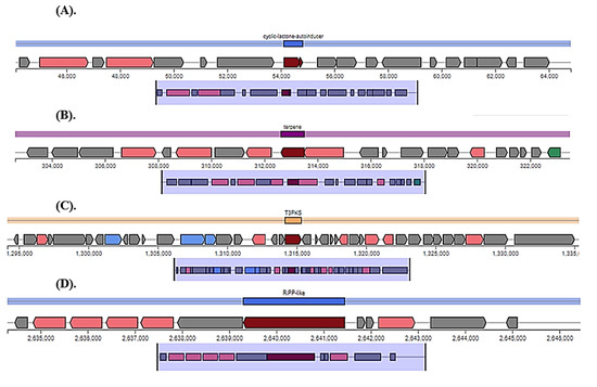 Shows the Lp YW11 genome’s EPS-producing sites. Core biosynthetic genes are represented by the colors red, pink, green, blue, and grey. Regulatory genes are represented by the color green (Other genes). (A) The autoinducer cyclic lactone (B) terpene (C) T3PKS (D) RiPP likes.