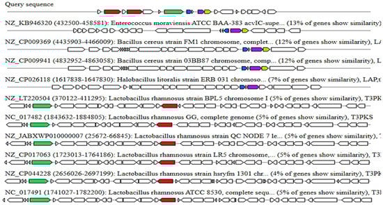 In the genome of Lp YW11, antiSMASH predicted four key regions that create EPS, namely region 1 (cyclic lactone autoinducer), region 2 (terpene), region 3 (T3PKS), and region 4 (Ripp similar) (Figure 4). Comparative EPS-producing areas of and other Lactiplantibacillus plantarum genomes are shown in Figure 5.