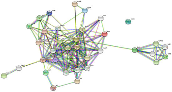 The 43 identified genes involved in the production of EPS were analyzed for their functioning regarding immune response generation and enhanced improvement in intestinal bowel diseases. The string network of 43 identified genes in the production of EPS is shown in Figure 6. The pathways involved in immune stress response and improvement in intestinal bowel diseases are D-alanine metabolism, folate biosynthesis, fatty acid biosynthesis, one carbon pool by folate, glycerophospholipid metabolism, peptidoglycan biosynthesis, biotin metabolism, pyrimidine metabolism, amino sugar and nucleotide sugar metabolism, purine metabolism and aminoacyl-tRNA biosynthesis (Figure S1). These pathways are involved in immune stress response and IBD improvement at gene and nucleotide levels. Any change in the micro-genetic level causes abrupt changes in the production of the essential enzyme that ultimately causes alterations in the whole metabolic pathways.