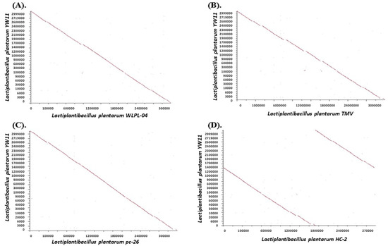 Collinearity relationship of YW-11 with (A) WLPL04, (B). TMW, (C) pc-26 and (D) HC-2, strains of Lactiplantibacillus plantarum using SEED Viewer of RAST.