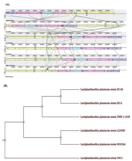 The Seed Viewer of RAST (https://rast.nmpdr.org/) accessed on 19 October 2022 was used to compare the collinearity of the Lactiplantibacillus plantarum strains YW11, HC-2, LLY-606, pc-26, TMW, and WLPL04. MAUVE Alignment (http://darlinglab.org/mauve/mauve.html) accessed on 20 October 2022, which primarily evaluates the evolutionary history of comparative genomes, conducted the multiple genome alignment of the genes. Additionally, CV-Tree (http://cvtree.online/v3/cvtree/) accessed on 22 October 2022 created a phylogenetic analysis utilizing the neighbor-joining method for comparative genome analysis.