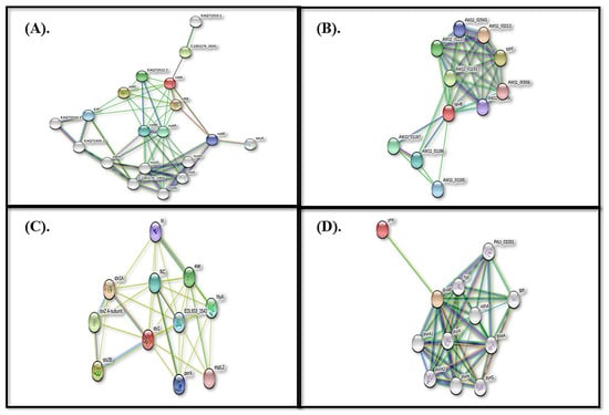 Interactome prediction through STRING. (A) ctd (B) spvB (C) stxB and (D) ymt.