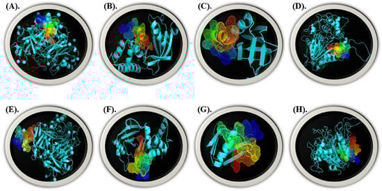 The streptin and ruminococcin-affinity A’s for the gut bacterial pathogenic genes cdt, spvB, stxB, and ymt were examined using HDock. Streptin’s strongest interaction energies were −216.97 with cdt (Figure 12A), −221.42 with spvB (Figure 12B), −179.47 with stxB (Figure 12C), and −122.43 with ymt (Figure 12D). Similar to this, the best binding scores for Ruminococcin-A with cdt, spvB, stxB, and ymt were −223.05 for cdt, −233.62 for spvB, −182.05 for stxB, and −270.65 for ymt (Figure 12E–H).