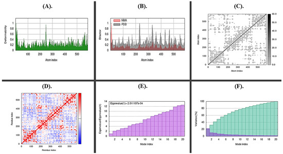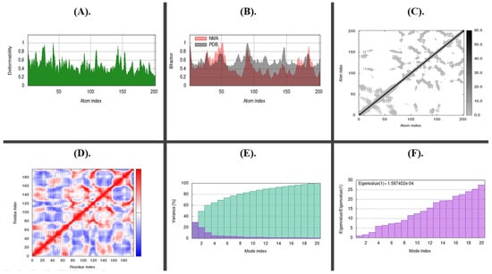 Shows a simulation of molecular dynamics of the best-docked complex of Ruminococ-cin-A with ymt. (A). Deformability of the complex; (B). B-Factor graph, the plot indicates a comparative PDB plot, but there are no validated structures of our molecules on PDB; (C). Elastic Network (Grey matter indicates stiffer region); (D). Covariance Map: correlated (red), uncorrelated (white), or anti-correlated (blue) motions; (E). Variance individual variance (purple) and cumulative variance (green); (F). The eigenvalue plot illustrates the minimum energy required to deform the complex.