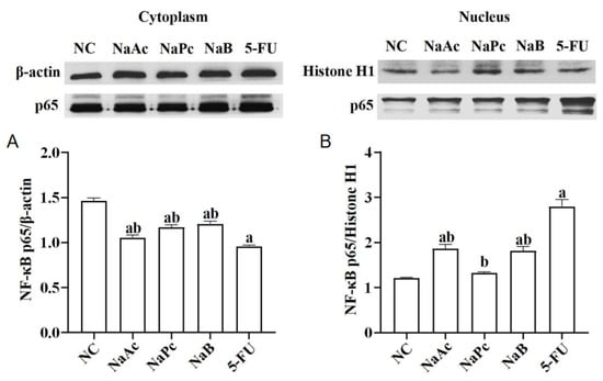 Effects of the SCFAs on NF−κB p65 expression (n = 3/group). The cells were pretreated with 100 μmol/L of SCFAs (NaAc, NaPc, and NaB) and then stimulated with 5-FU (2.5 mmol/L). The expression of NF−κB p65 in cell nuclear (A) and cytoplasmic (B) lysates were determined by Western blotting. Each experiment was repeated at least three times. Data are expressed as the mean ± SEM. a—p < 0.05, vs. the NC group; b—p < 0.05, vs. the 5-FU group.