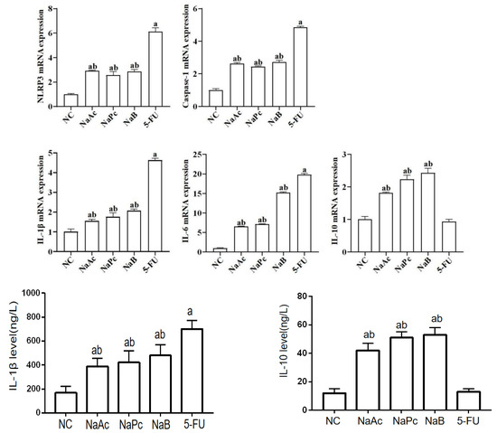 Effects of the SCFAs on inflammatory mediator expression by qRT-PCR and ELISA assay (n = 3/group). The cells were pretreated with 100 μmol/L of SCFAs (NaAc, NaPc, and NaB) and then stimulated with 5-FU (2.5 mmol/L). The mRNA expressions of NLRP3, Caspase−1, IL−6, and IL−10 were determined by qRT-PCR, and the contents of IL−1β and IL−10 were determined by ELISA. Each experiment was repeated at least three times. Data are expressed as the mean ± SEM. a—p < 0.05, vs. the NC group; b—p < 0.05, vs. the 5-FU group.