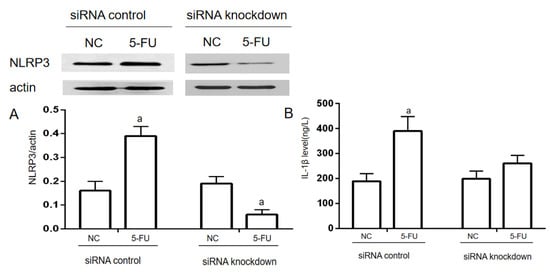 NLRP3 knockdown on 5-FU-induced IL−1β expression in THP−1 cells (n = 3/group). NLRP3-siRNA was used for NLRP3 knockdown in THP−1 cells. The siRNA-NLRP3 and ExFect 2000 Transfection Reagent mixture was added into the culture medium for 24 h. Then, the final concentration of 2.5 mmol/L 5-FU was added into the medium to induce the inflammatory response. (A) The expression of NLRP3 was determined by Western blotting assay. (B) The level of IL−1β in the culture medium was determined by ELISA assay. Each experiment was repeated at least three times. Data are expressed as the mean ± SEM. a—p < 0.05, vs. the NC group.