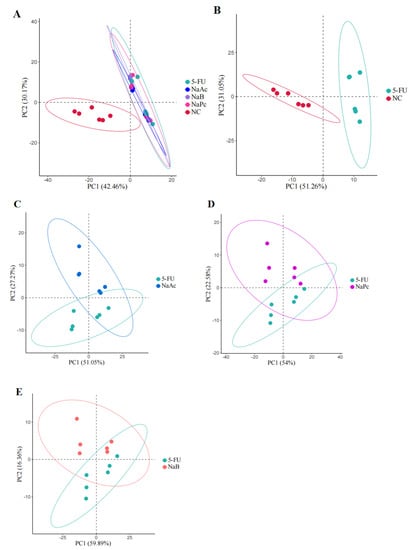 PCA score plot in the positive ion mode analysis for the effects of SCFAs on cellular metabolites (n = 6/group). (A): PCA score plot analysis in all groups; (B): PCA score plot analysis for the NC and 5-FU group; (C): PCA score plot analysis for the NaAc and 5-FU group; (D): PCA score plot analysis for the NaPc and 5-FU group; and (E): PCA score plot analysis for the NaB and 5-FU group.