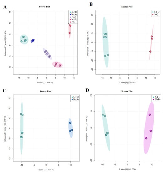In this study, UPLC−MS/MS was used to comprehensively analyze metabolic profiling and metabolites among the NC, 5-FU, NaA, NaP, and NaB groups. Two hundred and forty−seven ions in the positive mode ions were detected in the cell samples. PCA was used for the first time for an unsupervised comprehensive observation of cell samples. Samples from the 5-FU group showed a deviation from the NC group in terms of metabolite profiles, suggesting that the endogenous metabolites in the cells changed significantly after model making (Figure 5). Compared with the 5-FU group, the NaAc, NaPc, and NaB groups were closer to the NC group in the principal component direction. Simultaneously, the separating trends among the NaA, NaP, NaB, and 5-FU groups were clear.