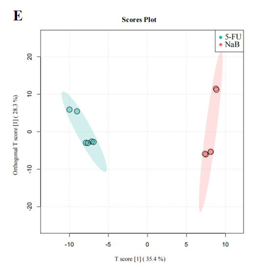 OPLS−DA score plot in the positive ion mode analysis for the effects of SCFAs on cellular metabolites (n = 6/group). (A): OPLS−DA score plot analysis in all groups; (B): OPLS−DA score plot analysis for the NC and 5-FU group; (C): OPLS−DA score plot analysis for the NaAc and 5-FU group; (D): OPLS−DA score plot analysis for the NaPc and 5-FU group; and (E): OPLS−DA score plot analysis for the NaB and 5-FU group.