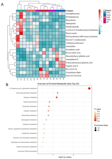 As a supervised multivariate analysis method, OPLS−DA showed the distinct separation of the NC and 5-FU groups in the positive ionic modes. The ions with VIP > 1.0 and p < 0.05 were significant differential metabolites in the present study. Twenty-four cell metabolites with significantly altered expression were screened between the 5-FU and NC cohorts. On applying the OPLS−DA model to evaluate the changes among the NaAc, NaPc, NaB, and 5-FU groups, the metabolic profile between the 5-FU group and the NaAc, NaPc, and NaB groups were shown to be completely separated, and 20 significantly altered cellular metabolites were screened in the NaAc, NaPc, NaB, and 5-FU groups (Table 1).