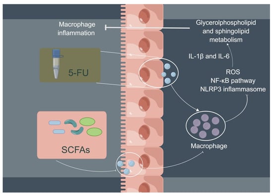 Potential mechanism of intestinal SCFAs inhibiting 5-FU-induced macrophage inflammation. 5-FU can activate intestinal mucosal macrophages, and activated macrophages secrete a large number of pro-inflammatory cytokines to cause intestinal mucosal damage (chemotherapy intestinal mucositis). SCFAs are beneficial metabolites produced by bacteria in the gut. Three main SCFAs (acetate, propionate, and butyrate) inhibited 5-FU-induced THP-1 cell inflammation and reduced pro-inflammatory cytokine expression (IL-1β and IL-6) via inhibiting NF-κB signaling pathway and NLRP3 inflammasome activation by regulating glycerolphospholipid and sphingolipid metabolism.