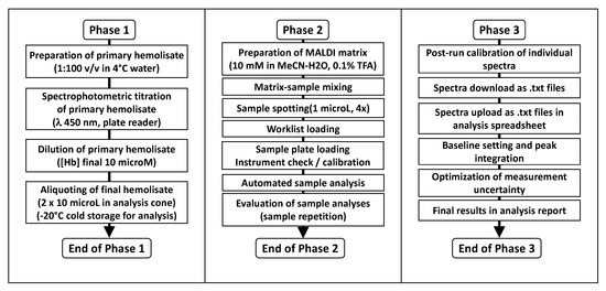Optimization involved adaptation of some general instrumental procedures, preparation of red blood cell samples, sample preparation for MALDI analysis, sample deposition by manual “spotting”, spot analysis by MALDI laser rastering, post-acquisition signal integration and calculation of results.