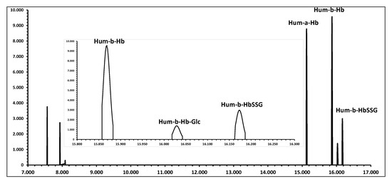 - Biroccio, A.; Urbani, A.; Massoud, R.; di Ilio, C.; Sacchetta, P.; Bernardini, S.; Cortese, C.; Federici, G. A quantitative method for the analysis of glycated and glutathionylated hemoglobin by matrix-assisted laser desorption ionization-time of flight mass spectrometry. Anal. Biochem. 2005, 336, 279–288. [Google Scholar] [CrossRef]