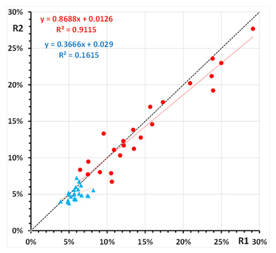 Replicate measurement of glutathionyl-hemoglobin (●) and of glycated hemoglobin (▲) in 23 samples of a human red blood cell hemolysate. Shown are the least-squares regression lines of the second replicate (R2) vs. the first replicate (R1) for both hemoglobin forms.
