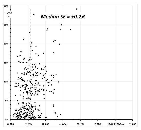 The values of the SE span from ±0.03% to ±1.2%, with a median SE of ±0.2% and median values for the batches between ±0.1% and ±0.5%. The insert of Figure 8 shows a plot of SE vs. HbSSG percent in the samples with a few extreme SE values measured both for very low and for some very high values. While the former corresponds to samples where HbSSG is in fact absent, SE for a few high-level samples does not exceed ±0.8%. The corresponding Coefficient-of-Variation (CV% = SE/HbSSG) has a median value of 3.7% (inter-quartile range 2.0–9.6%).