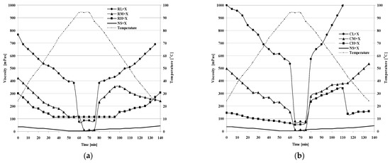Viscosity curves of blackberry jelly-like desserts obtained from physically modified corn starch sweetened with sucrose (a) or xylitol (b).