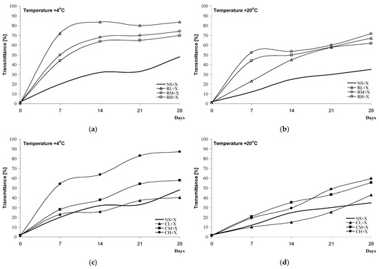 Here, the intensity of retrogradation was determined by measuring the transmittance of the blackberry jelly-like desserts at +4 °C (Figure 4a,c and Figure 5a,c) and +20 °C (Figure 4b,d and Figure 5b,d). Higher values of transmittance (%) indicate an intensification of retrogradation. Regardless of the method of starch modification used for the preparation of the blackberry jelly-like desserts, the samples were characterised by higher values of transmittance (%) at +4 °C than the same samples at +20 °C. This observation is supported by a study by Włodarczyk-Stasiak et al. [27] on the retrogradation of gels of waxy corn starch, which demonstrated a more intensive rate of the process at lower temperatures.