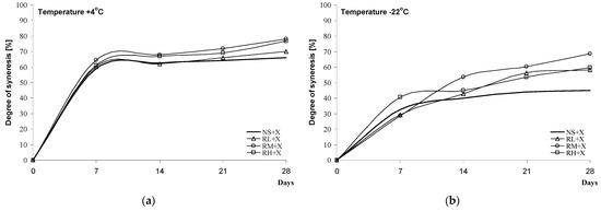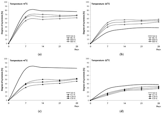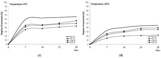 Measurements of the degree of syneresis of blackberry kissels can be an indicator of starch (amylopectin) tendency towards the liberation of water as a consequence of retrogradation. Here, the susceptibility of blackberry kissels to syneresis was analysed under refrigeration conditions at +4 °C (Figure 6a,c and Figure 7a,c) and after deep freeze at −22 °C (Figure 6b,d and Figure 7b,d). Distinct differences in the syneresis values were noted in relation to the method of the modification of the starch used for the preparation of the kissels. Desserts obtained on the basis of chemically modified starch sweetened with saccharose, with various degrees of cross-linking, were characterised by syneresis at levels of 60–79% at +4 °C and 49–55% at −22 °C, i.e., values close to or higher than those obtained for native starch (Figure 6a,b). Much higher stability and therefore smaller seepage were characteristic of kissels based on inhibited starch, the values for which were 43–50% at +4 °C and 24–30% at −22 °C (Figure 6c,d). No correlation was noted between the degree of substitution/level of inhibition and the value of syneresis. When xylitol was used as the sweetener, slight decreases in syneresis were noted as follows: 9% at +4 °C and 6% at −22 °C for samples with chemically modified starch (Figure 7a,b) and 6% at +4 °C and 4% at −22 °C in for kissels with inhibited starch (Figure 7c,d). In the case of samples from inhibited starch and xylitol, it was noted that regardless of the temperature at which the kissels were kept (+4 °C or −22 °C), syneresis decreased with decreases in the level of inhibition (CL + X < CM + X <CH + X).